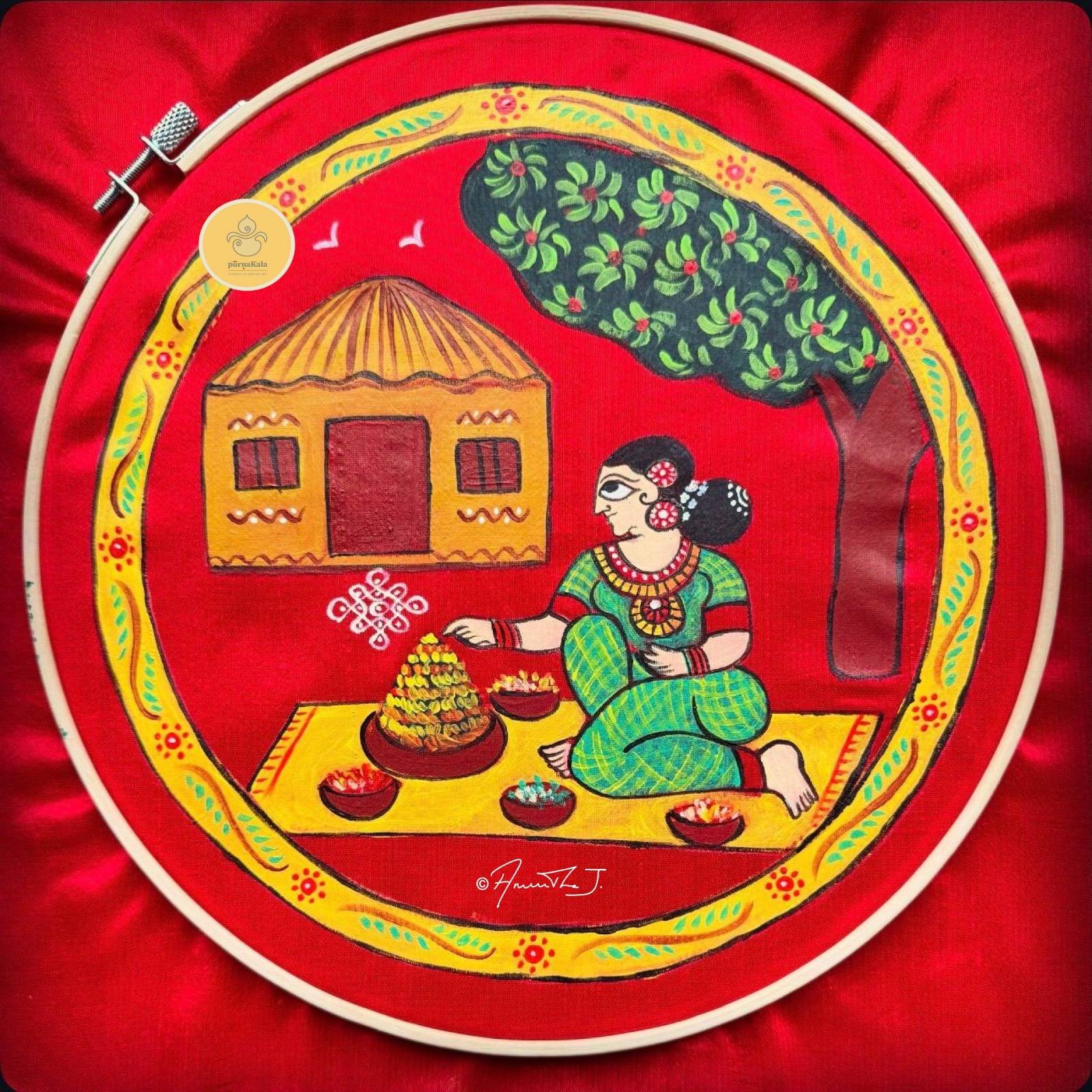 village of Cheriyal in Telangana. These scrolls are known for their vibrant aesthetics and vivid storytelling rooted in local folklore and community traditions. In this workshop, come create a Cheriyal painting on a silk cloth panel.
